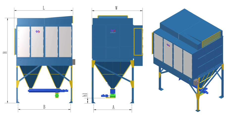 This unit is composed of fan, filter box, frame flat cloth bag, ash cleaning and vibrating mechanism, hopper and ash discharging device, which can work automatically according to program control.