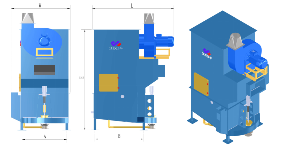 The dust collector is divided into an upper box and a lower box. The upper box includes: air inlet and outlet, distribution air supply pipe, two water baffles, spray head (ABS) and centrifugal fan. (JJDCC-19, 24 and 33 dust collectors do not include centrifugal fans)